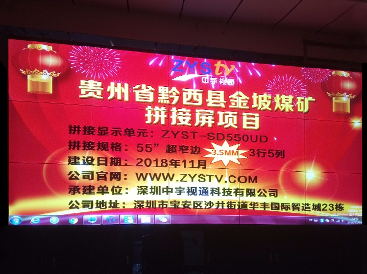 貴州省黔西縣金坡煤礦55寸超窄邊3.5mm3行5列液晶拼接屏項目,安裝調試完成并且順利驗收,中宇視通科技全體職工從深圳發來賀電!