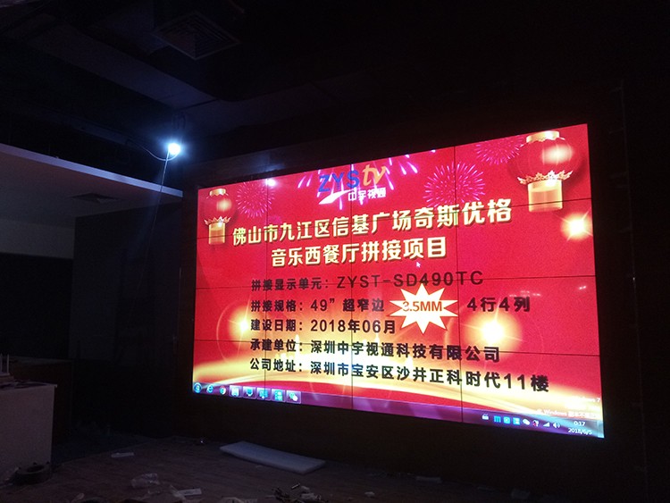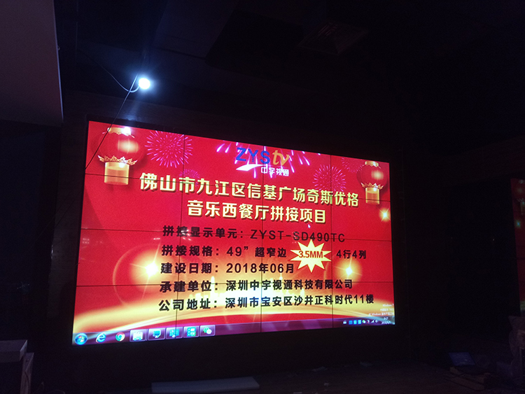 佛山市九江區信基廣場奇斯優格音樂西餐廳選擇中宇視通科技4*4片49寸*3.5mm拼縫液晶拼接屏,項目整體安裝完成,安裝以后奇斯優格音樂西餐廳高端大氣上檔次,信基廣場附近的朋友可以去體驗一番不一樣的風格,奇斯優格音樂西餐廳_時尚前衛裝修+口味獨特出眾,鎖客+吸金,一步到位!奇斯優格音樂西餐廳音樂曲庫,擁有由1100萬首單曲組成,可以幫助您提升音樂氛圍.以時間,空間,客流量等不同維度設計的多種音樂場景,滿足您的不同音樂播放需求。