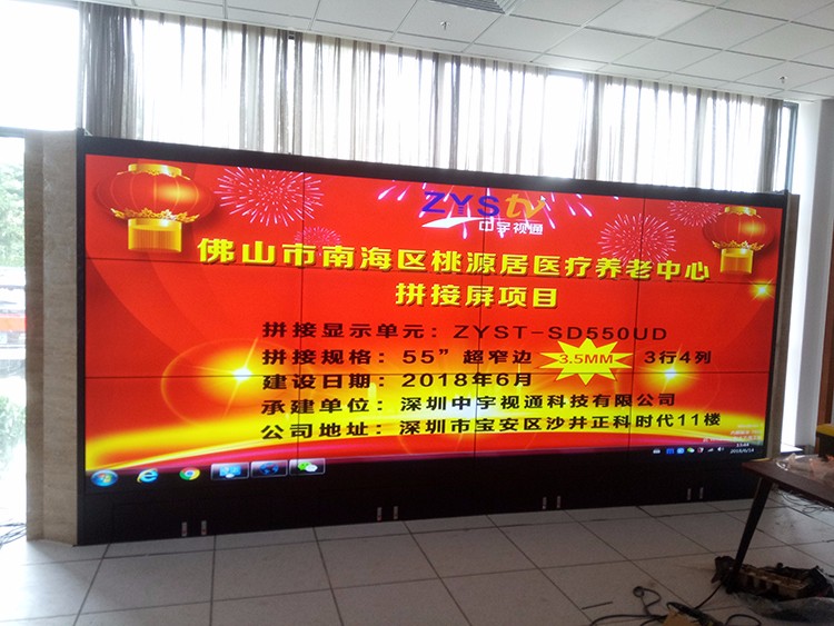 佛山市南海區桃源居醫療養老中心拼接屏項目選擇中宇視通55寸3.5mm拼縫3行*4利12片液晶拼接屏,項目順利完成調試。