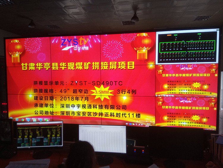 甘肅華亭縣華硯煤礦污水處理站49寸3.5mm拼接屏項目安裝調試完成,甘肅華亭煤電股份有限公司位于陜甘寧三省交匯處的甘肅省平涼市華亭縣境內,南距陜西省寶雞市160公里,北距甘肅省平涼市50公里,西距甘肅省天水市210公里,寶中鐵路橫穿腹地,省級公路縱橫交錯,交通條件十分便利。公司共有地質儲量15.05億噸,可采儲量9.31億噸,煤的發熱量為21-25MJ/kg左右,屬低灰、低硫、低磷,高化學活性、高揮發性、高熱質的長焰煤和不粘煤,是良好的氣化、化工和動力用煤,“樺亭”、“硯北”牌潔凈煤,享譽全國,遠銷海外,深受廣大用戶青睞。