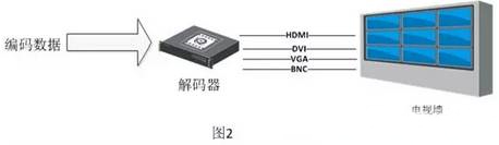 高清解碼器的主要作用,在于接收前端高清編碼圖像并解碼,然后通過自身的各種視頻 輸出接口,如HDMI/DVI/VGA/BNC,輸出顯示到電視墻上。它與前端攝像機正好是一個正反過程,前端攝像機輸入圖像,進行編碼;解碼器進行解碼,輸出圖像。針對項目大小和中心電視墻的規模,高清解碼器又有兩種主要的應用: