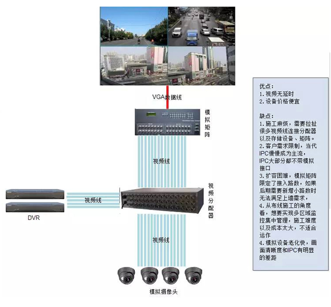 常見的結構圖如上,這種應用場景下,應該說是一種專業上墻辦法了。大家可以看出,雖然模擬矩陣本身不貴,但要使用大量的視頻線,甚至光端機,而且必須要從攝像機所在位置拉線到中心來,這個施工成本會非常高。更重要的一點是,這種辦法更適合模擬攝像機和DVR,但高清網絡時代,大部分IPC根本沒有視頻輸出,那么這種辦法就會陷入死局,這也是傳統的模擬矩陣廠商在高清時代碰到的一個最大挑戰。