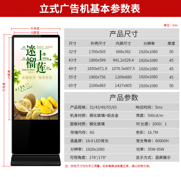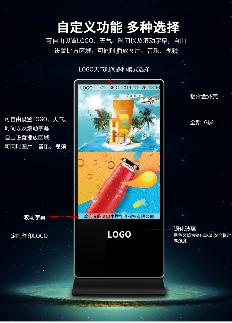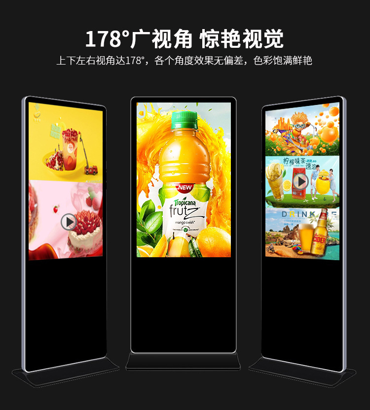 65寸立式液晶廣告機系列產品屬于壁掛、落地式數字標牌廣告機,外觀優美,全身五金冷軋鋼板噴涂,邊條鋁合金型材,面板4MM專用鋼化玻璃,橫式16:9液晶屏,高清效果。內屏采用三星、LG原裝工業級液晶屏,配以最先進的密集型LCD光源背光系統,背光色彩還原度好,超高對比度,強光下依然清晰無比。特別適合高端品牌的綜合多媒體技術,向消費者傳遞全方位的產品信息,促銷信息等。提升產品在銷售終端的顯現率和陳列效果,刺激沖動性購買。相比于其他傳統媒體和促銷方式,投入極低廉,性價比極高。